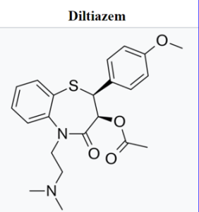 Diltiazem, продаваемый, в частности, под торговой маркой Cardizem, — это недигидропиридиновый блокатор кальциевых каналов, применяемый для лечения повышенного артериального давления, стенокардии и некоторых видов сердечной аритмии. Он также может применяться при гипертиреозе, если бета-блокаторы не подходят. Diltiazem принимается внутрь или вводится внутривенно. При инъекционном введении действие препарата обычно начинается через несколько минут и длится несколько часов.