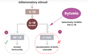 Rytvela — новый, first-in-class аллостерический пептидный ингибитор рецептора интерлейкина-1 (IL-1R), разработанный компанией Maternica Therapeutics, демонстрирующий многообещающие результаты в лечении преждевременных родов, вызванных воспалением. Доклинические исследования показывают, что он снижает частоту преждевременных родов на 40–70%, улучшает выживаемость новорожденных и защищает развитие органов без общей иммуносупрессии. Будучи неконкурентным антагонистом, Rytvela связывается с вспомогательным белком рецептора IL-1 (IL-1RAcP), ингибируя специфические нижележащие сигнальные пути (c-jun, Rho GTPase), связанные со стрессом и воспалением, а не широкое ингибирование NF-κB.